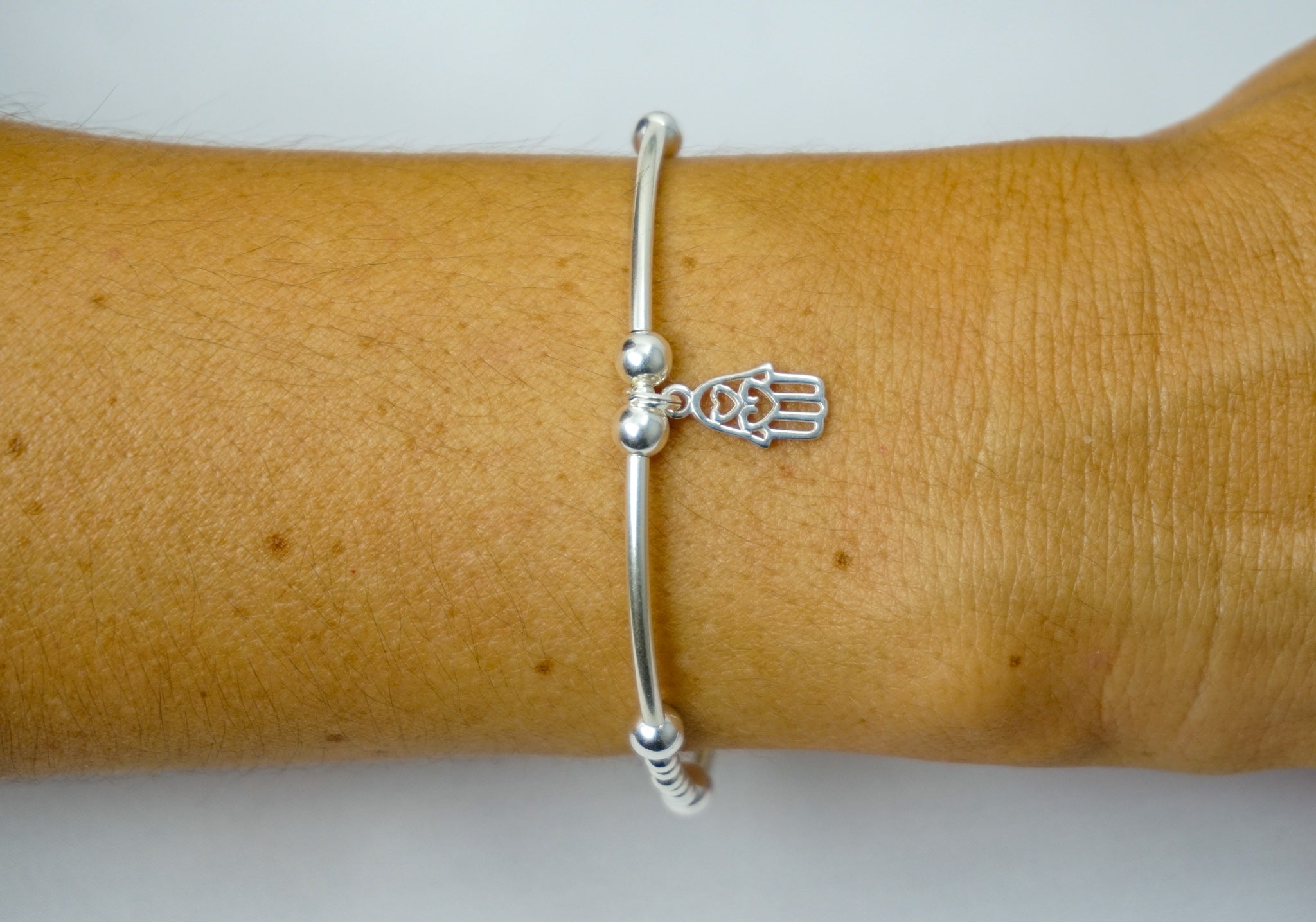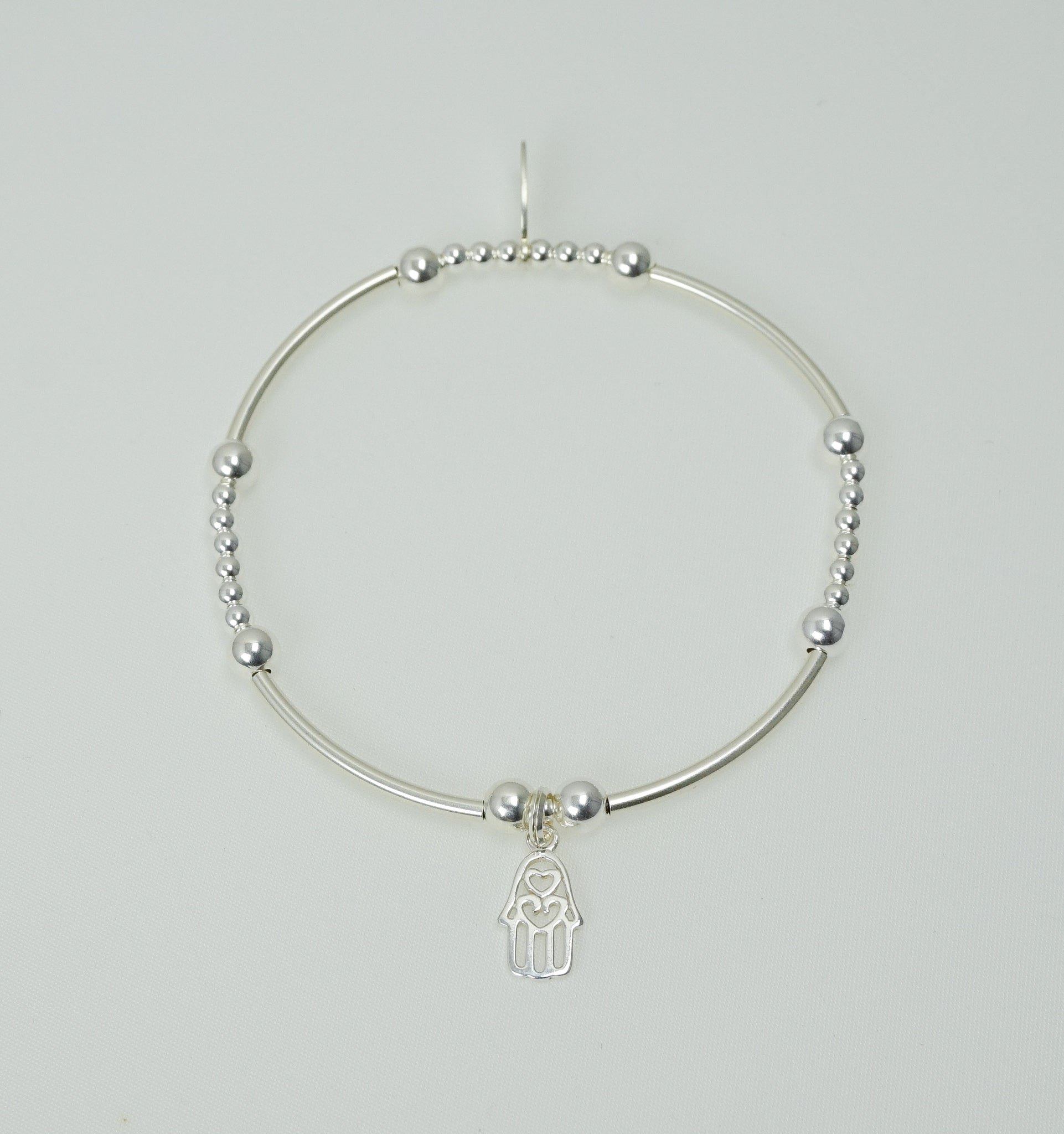 Hand of Hamsa charm on a 2mm Noodle & Bead Sterling Silver bracelet