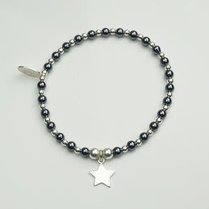 Sterling Silver Star charm on a 4mm Black Hematite and 3mm Sterling Silver bead bracelet