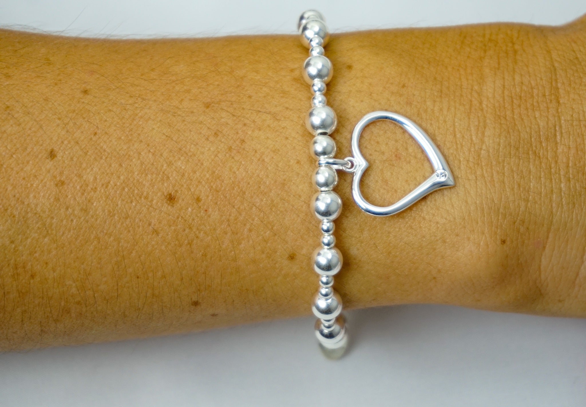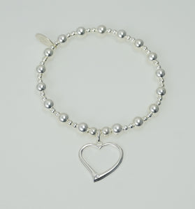 Large Open Heart charm with diamante stone on a 6mm & 3mm Sterling Silver bead bracelet