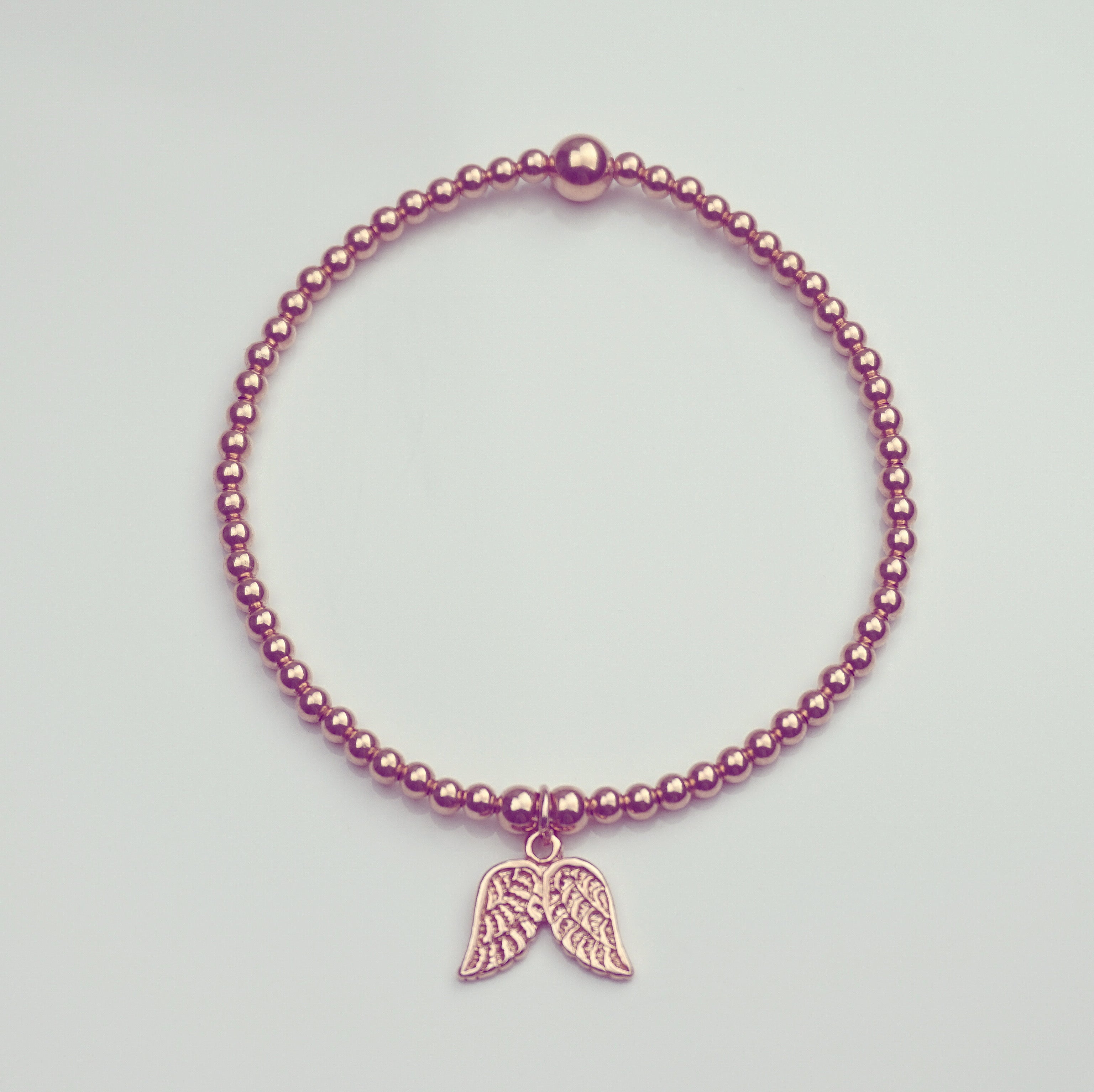 Rose Gold Plated Double Angel Wing charm on a 3mm Rose Gold Filled bead bracelet